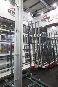 Graf Synergy zaprezentował na targach swoją koncepcję automatycznego magazynu do zarządzania skrzydłem i ramą podczas etapów montażu po spawaniu.