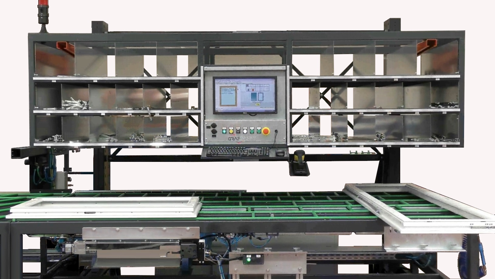 FAZ II to kompaktowe i zautomatyzowane centrum pracy zaprojektowane przez GRAF Synergy, które ma na celu przyspieszenie i ustandaryzowanie montażu okuć na skrzydłach PVC. Dzięki podwójnej stacji – stole przygotowawczym i stole wkrętarskim – umożliwia montaż do 240 ram na zmianę, z jednym operatorem.
